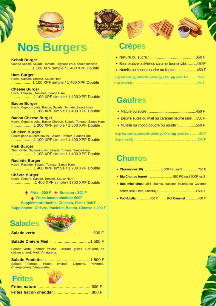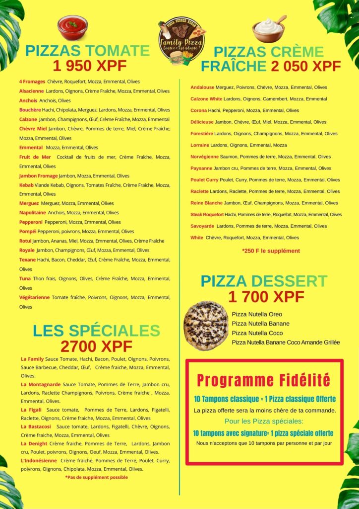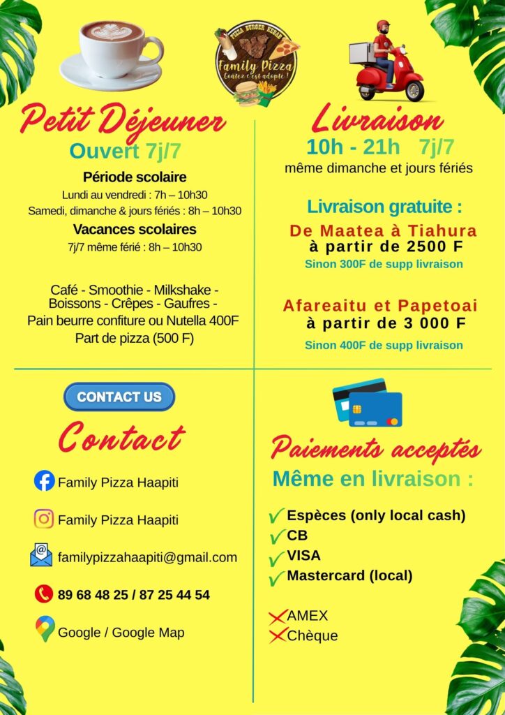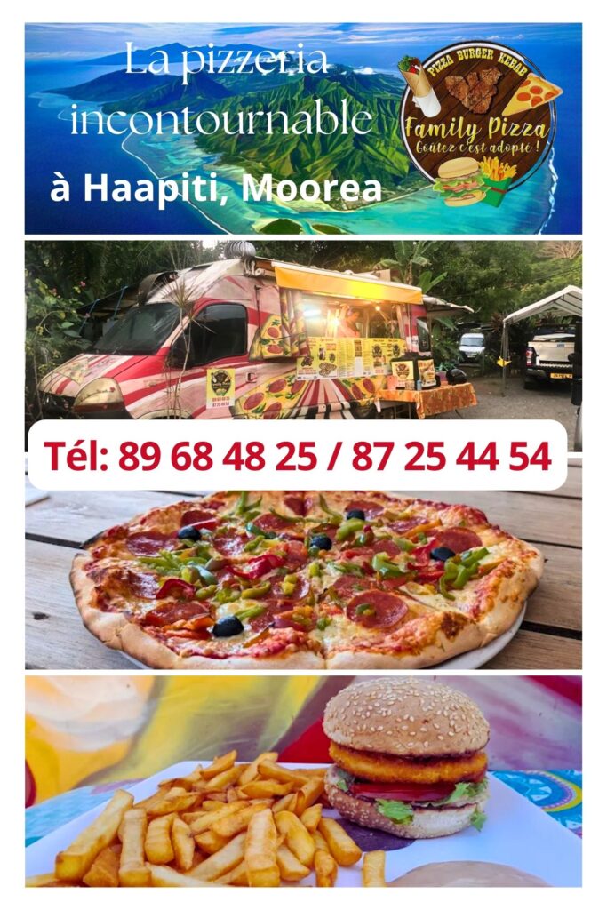 📍 Located in Haapiti, at PK 24 on the mountain side, between the Catholic church and Yilian store, Family Pizza welcomes you 7 days a week, from 10 a.m. to 9 p.m. non-stop, even on Sundays and public holidays.